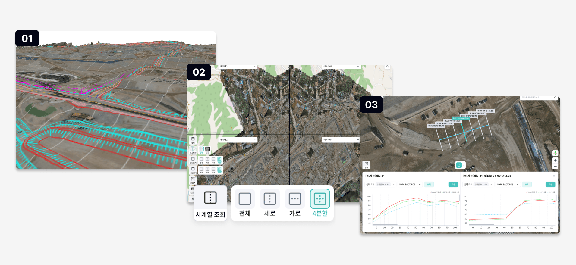 01. Monitor site equipment in real-time to easily check the location and operational status of equipment through a virtual construction site.