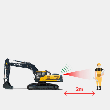 HD Hyundai Construction Equipment was the first company in Korea to commercialize the AAVM system. The AAVM system allows the operator to see the surrounding environment at a glance without blind spots through four cameras mounted on the equipment. To prevent accidents, the monitor displays a warning sign when a moving object is detected within a certain radius around the equipment. To further enhance worker safety, we plan on developing and applying an AI system incorporating sensor (e.g., radar) and camera technology to selectively recognize objects such as pedestrians and trucks and automatically slow down and stop the excavator during turning or driving depending on the level of risk.