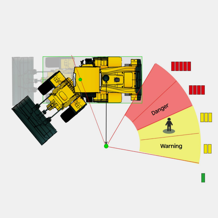 The AAVM+ system has furthered improved the rear-side safety of wheel loaders by incorporating a rear wide-angle radar sensor and a steering angle sensor into the AAVM system. The 180° wide-angle radar minimizes blind spots in the rear, even at the maximum steering angle, and an estimated trajectory is provided when driving in reverse based on the steering angle. By selectively detecting only objects within the expected trajectory, the radar minimizes unnecessary warnings, allowing the operator to work efficiently while reducing the risk of accidents. AAVM+ is a technologically advanced safety system for the construction equipment industry. Unlike similar systems offered by other companies, when an obstacle is detected within a hazard/warning area of interest, the area in question starts blinking to notify the operator. Moreover, the user can set the width and length of the hazard/warning area according to the equipment model and operating environment.