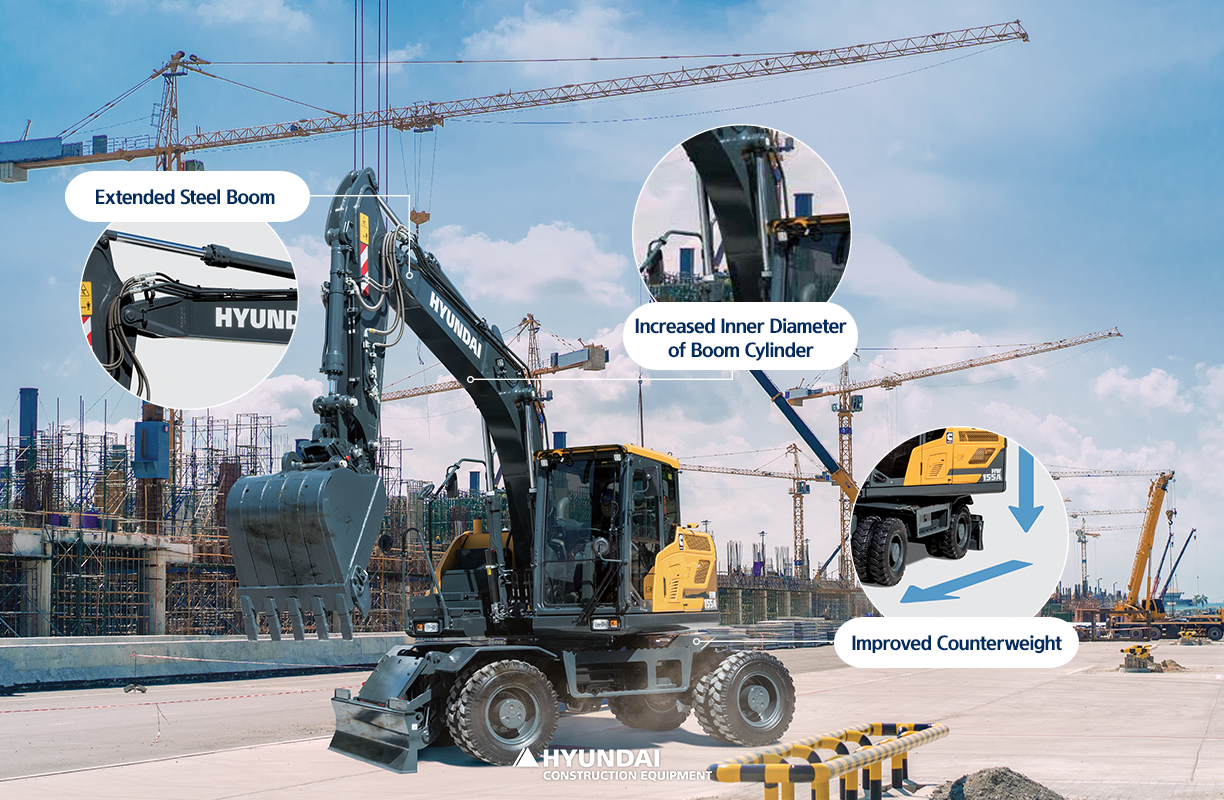 The counterweight on HW155A is 250 kg heavier than its previous models, increasing from 2.2 tons to 2.45 tons, which makes the machine more stable. The counterweight lamp is moved upward, preventing potential damages during operation at the worksites. Thanks to these improvements, the drivers can work in a more comfortable and convenient environment. Also, the boom cylinder's inner diameter has been increased and the length of the boom has been extended from 4.3 meters to 4.4 meters, enhancing its lifting force and range of work.