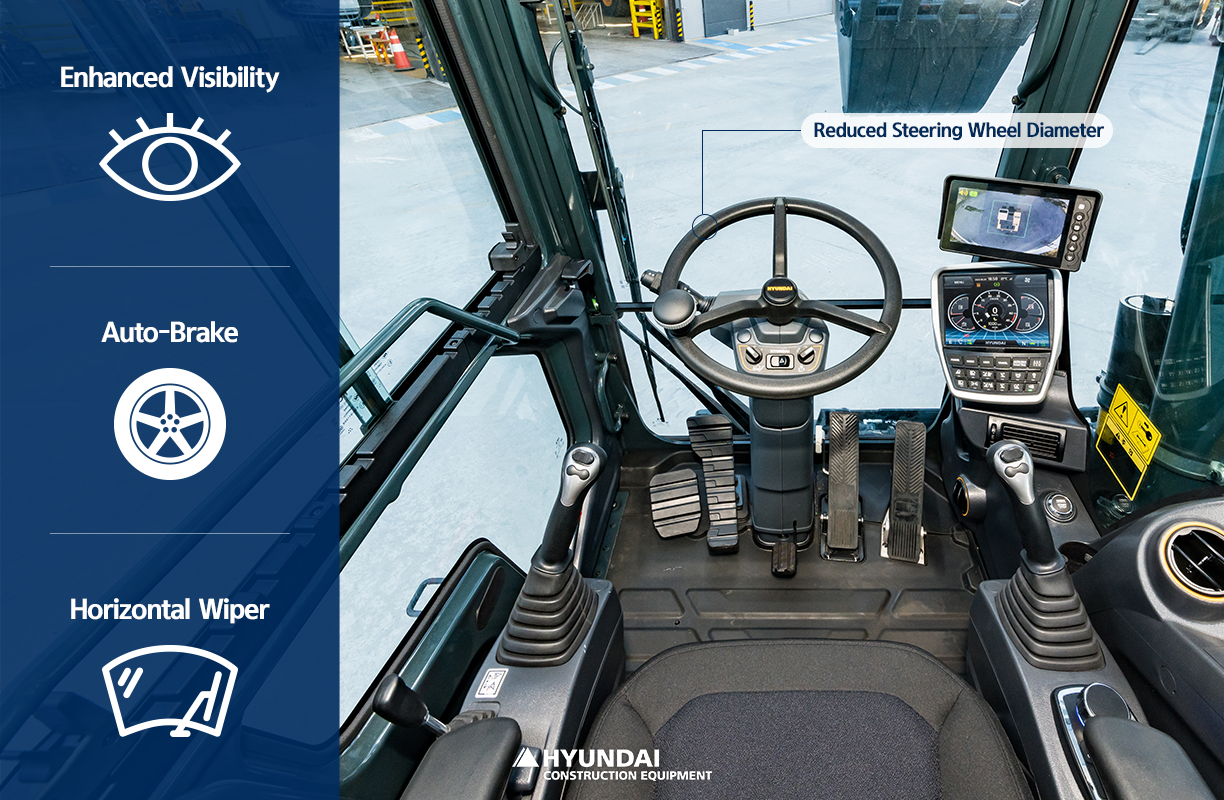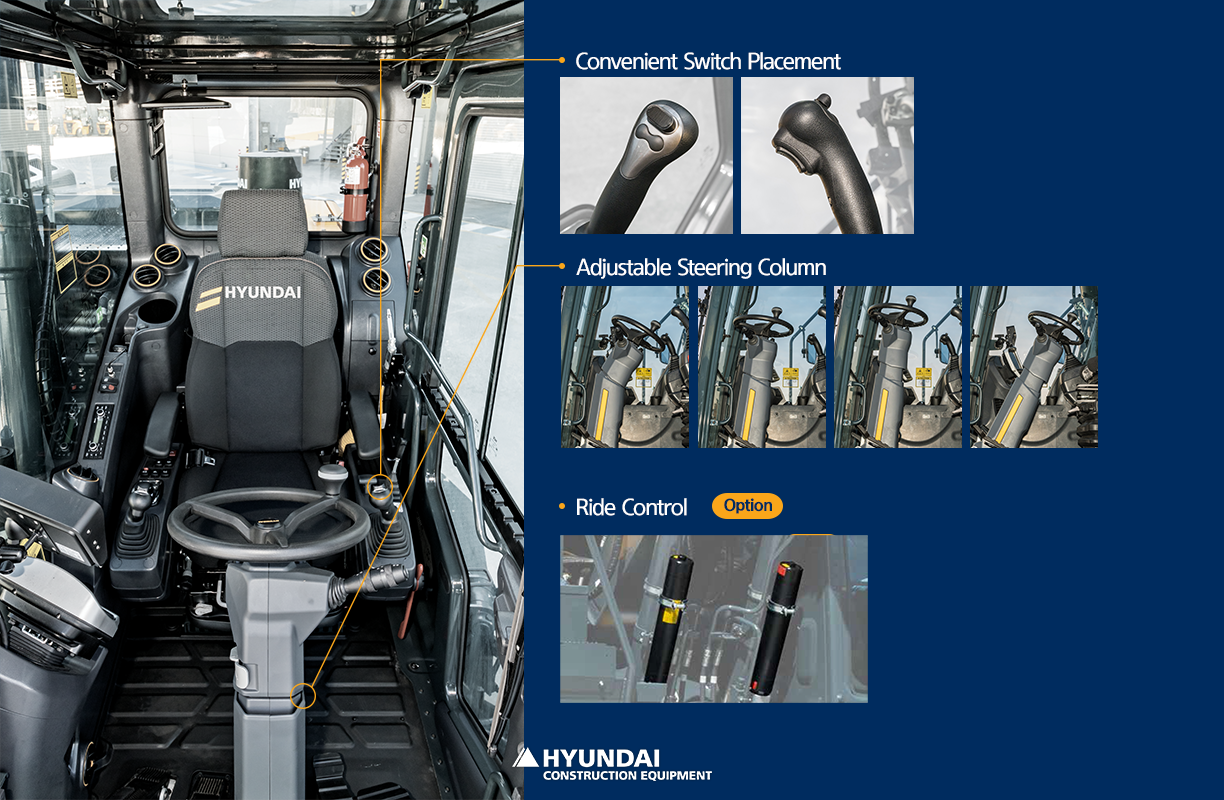 HW155A has a new technology applied that reflects voices for improvements from the customers who have purchased the previous model, HW145+. The drive/reverse switch and the ram lock switch have been placed above the joystick, making it easier to control the machine. In addition, drivers can now adjust the angle of the steering column according to their body shape.
