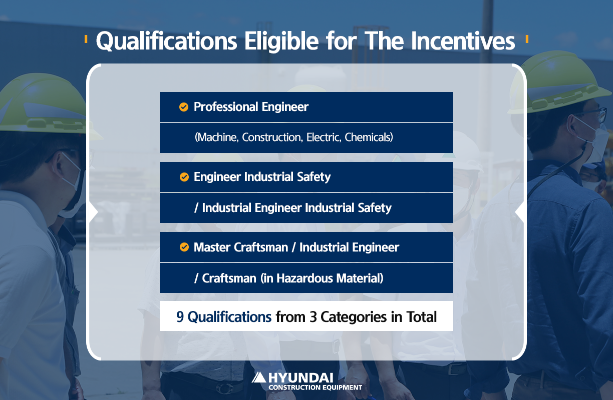 Hyundai Construction Equipment has adopted 'Work Safety Qualification Incentives", a new policy cultivating safety experts and building a safety culture in the company. This new incentive policy will give benefits to employees and executives who acquire safety-related qualifications, encouraging safety education and training as well as becoming the foundation for making the company a safer place. Let us learn more about the policy.