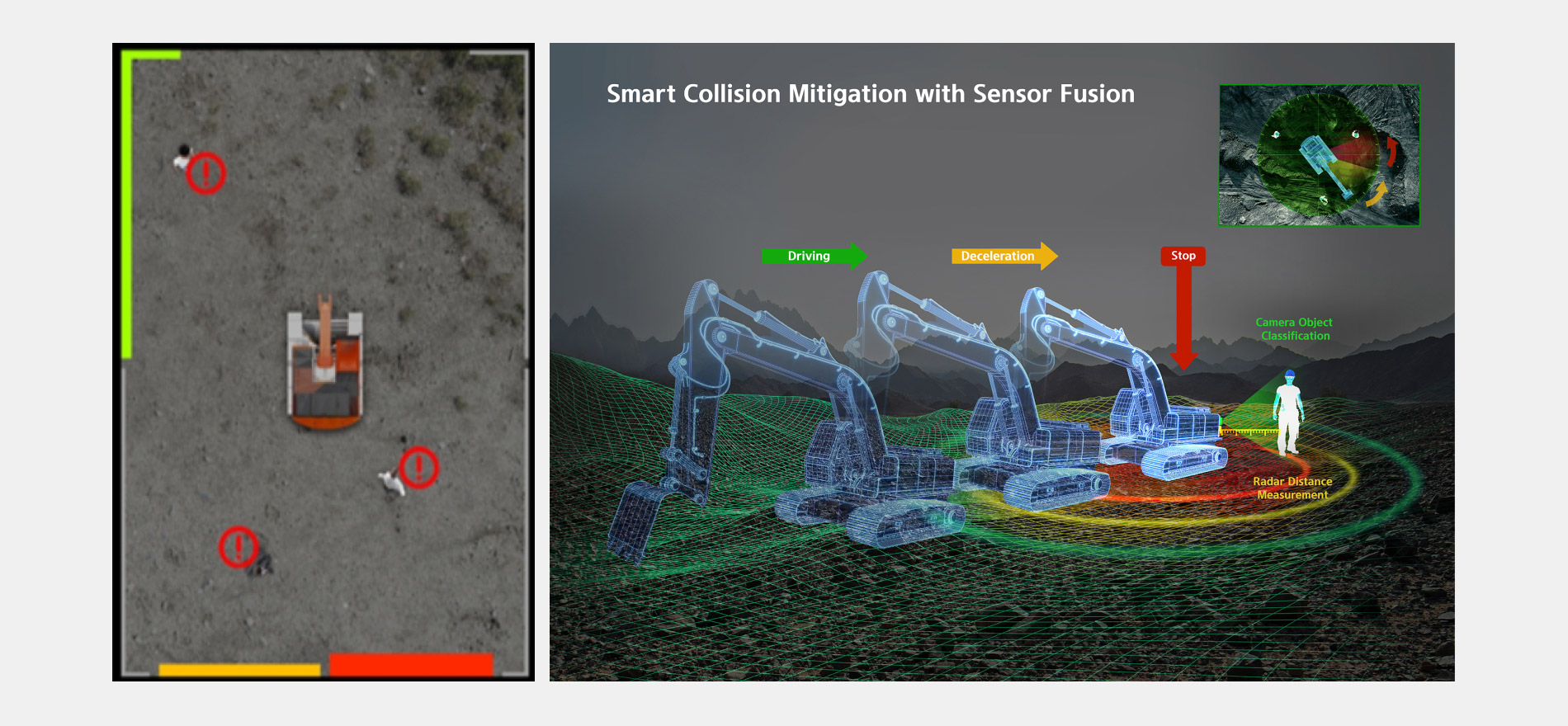 AAVM+ es un sistema mejorado de la seguridad trasera de los cargadores de ruedas mediante la combinación del sensor radar de ángulo amplio posterior y el sensor de ángulo de giro. Se minimizan los puntos ciegos traseros, incluso en movimiento de giro máximo, gracias al radar de ángulo amplio de 180°, y se informa sobre el recorrido estimativo en marcha atrás utilizando los datos del ángulo de giro. Detecta únicamente objetos dentro del recorrido estimativo en marcha atrás con el radar para evitar alertas innecesarias, permitiendo trabajar de manera eficiente y reducir el riesgo de accidentes. AAVM+ es un sistema de seguridad líder entre las tecnologías de la industria de equipos de construcción y, a diferencia de otras empresas, mejora la visibilidad del usuario mediante el parpadeo de la zona cuando detecta un obstáculo en el área de peligro o alerta. Además, el propio usuario puede configurar el ancho y el largo del área de peligro o alerta, según las condiciones operativas de trabajo y el modelo del equipo.