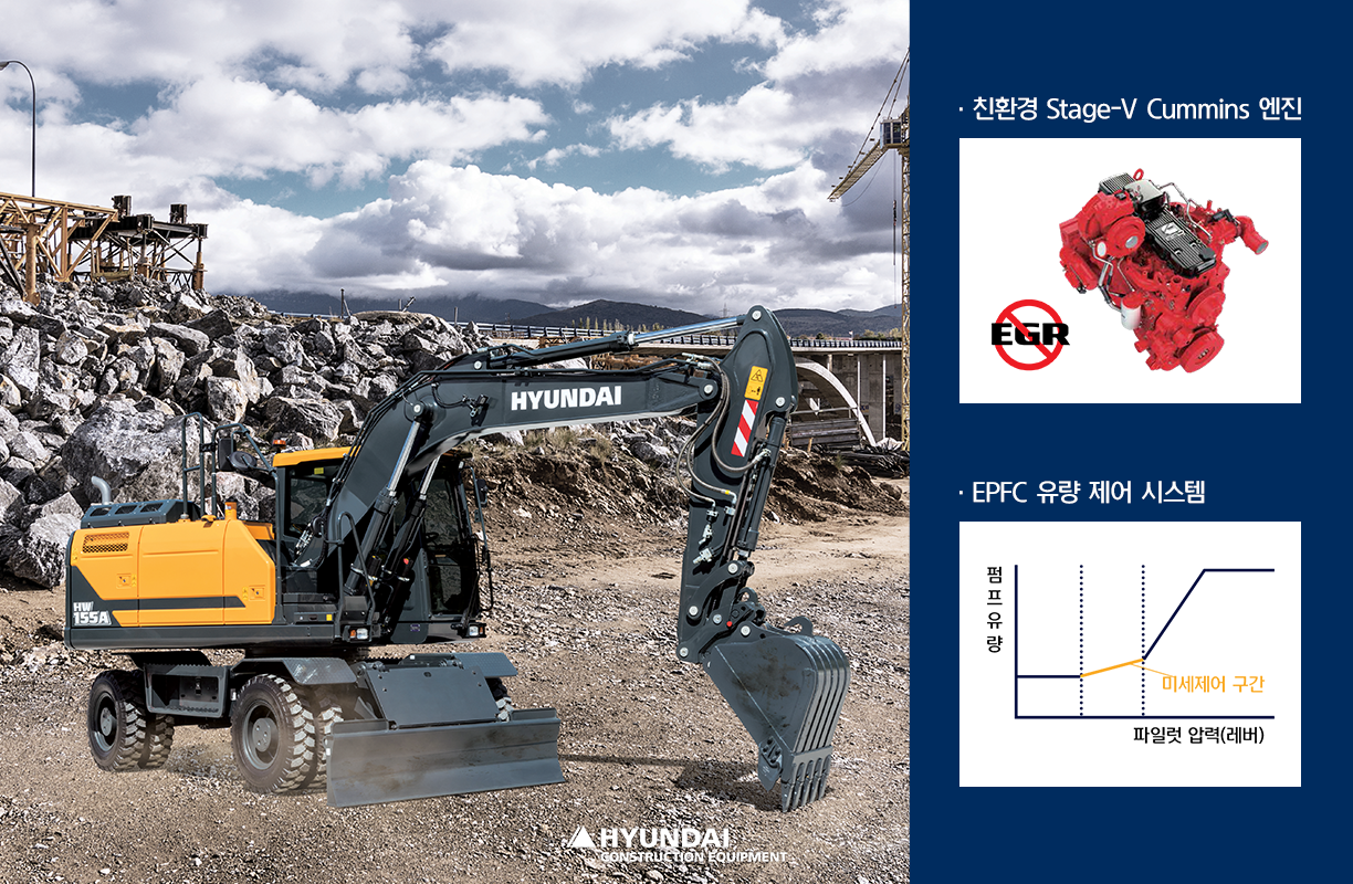 올해부터 강화된 국내 배기 규제에 대응하기 위해 HW155A와 HW165A는 EU Stage V 배기 조건을 충족하는 친환경 고성능 엔진을 장착했습니다. 해당 엔진은 EGR이 없는 형태로 배기가스를 냉각 및 재순환시키는 과정이 필요 없고, 엔진 본연의 성능 구현에 더욱 최적화되어 이전 모델 대비 5% 향상된 파워와 20% 증가된 최대 토크를 제공합니다. 더불어 냉각 효율화로 엔진 오일 교환 주기 또한 늘어났습니다.