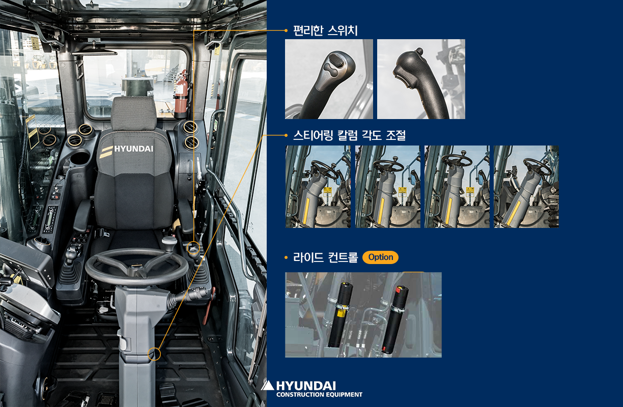 HW155A는 조작성 향상을 위해 기존 HW145+ 이용 고객님들의 개선 요구 사항을 반영한 신기술을 적용했는데요. 전·후진 스위치와 램락 스위치를 조이스틱 위에 배치시켜 보다 편리한 조종이 가능해졌습니다. 또한, 운전자마다 각기 다른 체형을 가진 것을 고려하여 스티어링 칼럼 각도 조절 기능을 추가, 운전자가 체형에 맞춰 각도 조절을 할 수 있습니다.