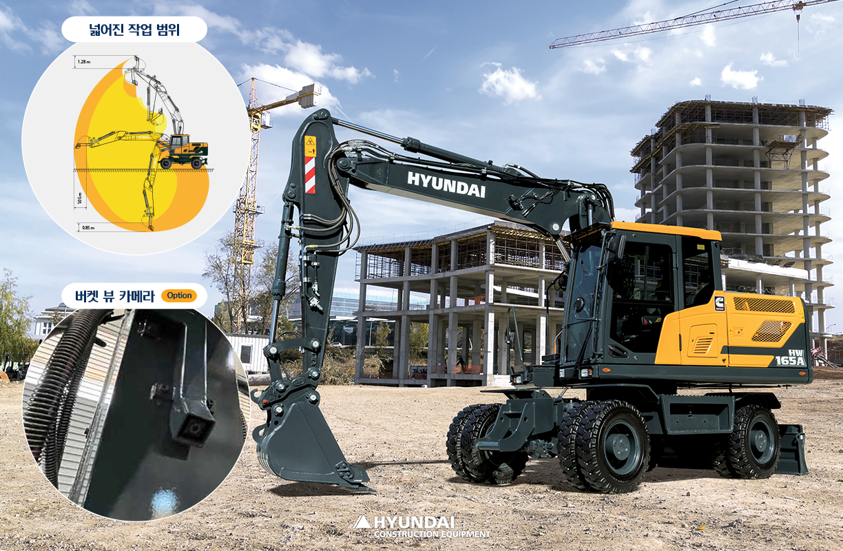 HW165A는 HW155A와 비슷한 사양이지만, 조금 더 다양한 작업 현장의 요구를 만족할 수 있도록 설계되었습니다. HW165A는 3단 붐과 2.5m 암을 표준으로 적용하여, HW155A 대비 모든 작업범위가 넓어졌는데요. 1.05m 더 멀리, 1.28m 더 높이, 0.85m 더 깊은 곳까지 작업을 할 수 있습니다. 옵션 사항으로는 버켓 뷰 카메라가 새로이 추가되어 더 안전하고 정확한 작업을 지원하죠. 이미 선진시장에서 기술력과 효용성이 검증된 3단붐은 어떠한 작업 현장에서도 빛을 발할 것입니다.