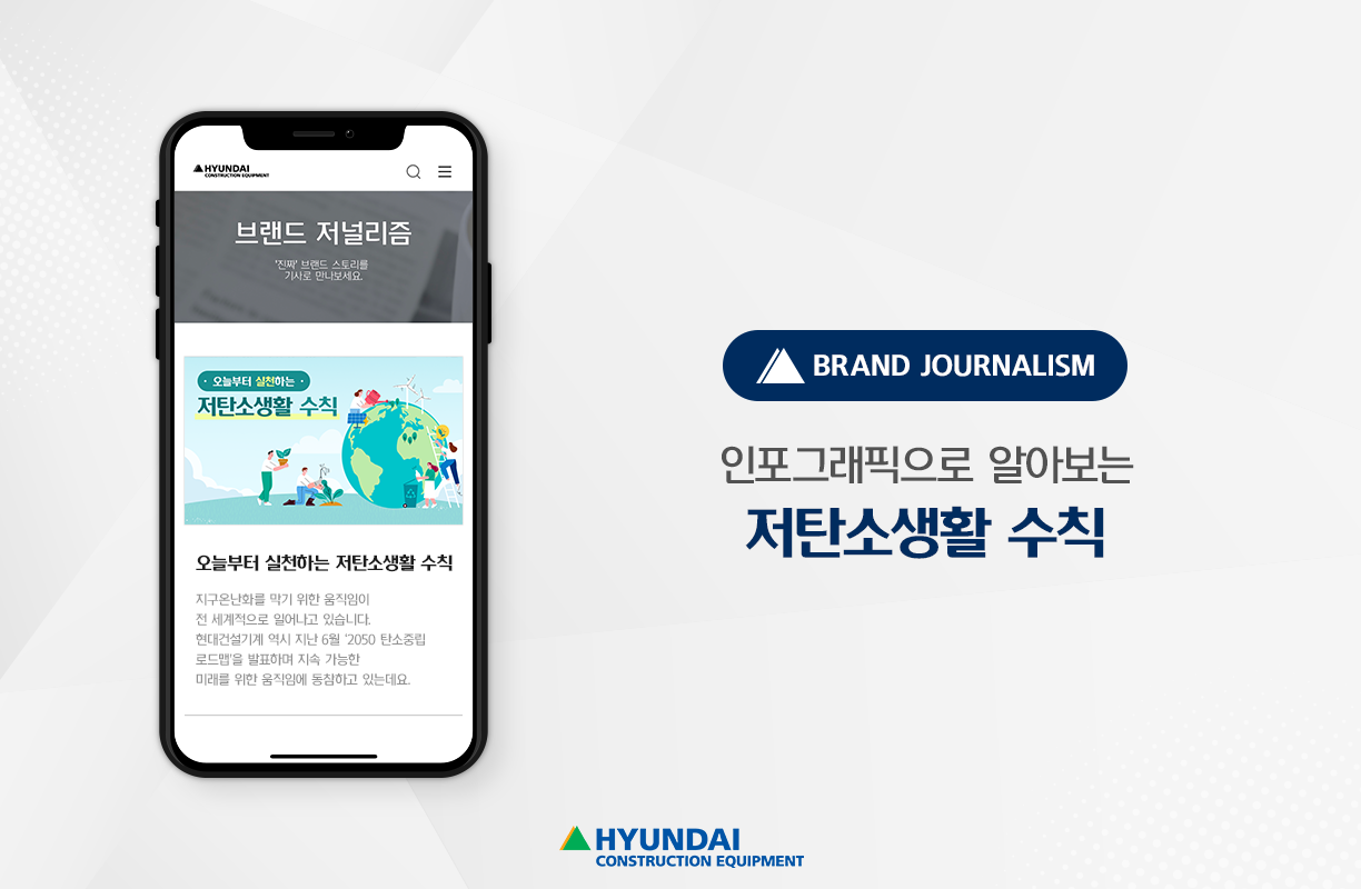 지구온난화를 막기 위한 움직임이 전 세계적으로 일어나고 있습니다. 현대건설기계 역시 지난 6월 '2050 탄소중립 로드맵'을 발표하며 지속 가능한 미래를 위한 움직임에 동참하고 있는데요. 8월 브랜드 저널리즘에서는 우리가 일상생활에서 실천할 수 있는 ‘저탄소생활 수칙’을 인포그래픽으로 제작해 보았습니다. 집에서, 직장에서, 운전 시에도 탄소 배출을 줄일 수 있는 방법을 확인하고, 우리 모두 저탄소생활을 실천해봅시다.