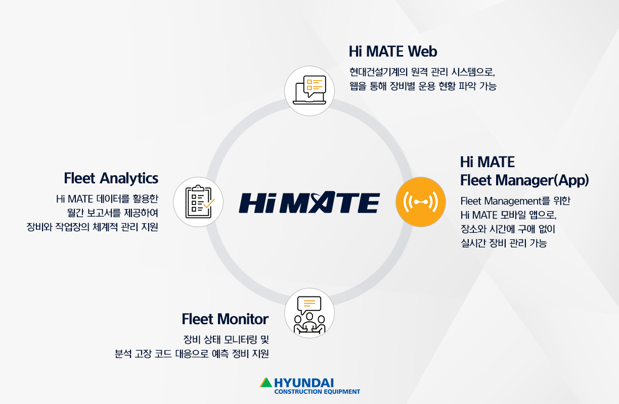 하이메이트 시스템의 편리성이 집약된 모바일 앱, 하이메이트 플릿 매니저(Hi MATE Fleet Manager)는 지난 2020년 기능과 UI/UX를 대폭 업그레이드하였습니다. 새롭게 태어난 하이메이트 플릿 매니저는 직관적인 메뉴 구성과 정보를 한눈에 파악할 수 있는 화면 설계가 특징인데요. ‘내 손안의 장비 관리 솔루션’이라는 말이 딱 어울리는 하이메이트 플릿 매니저의 기능을 하나씩 살펴봅니다.