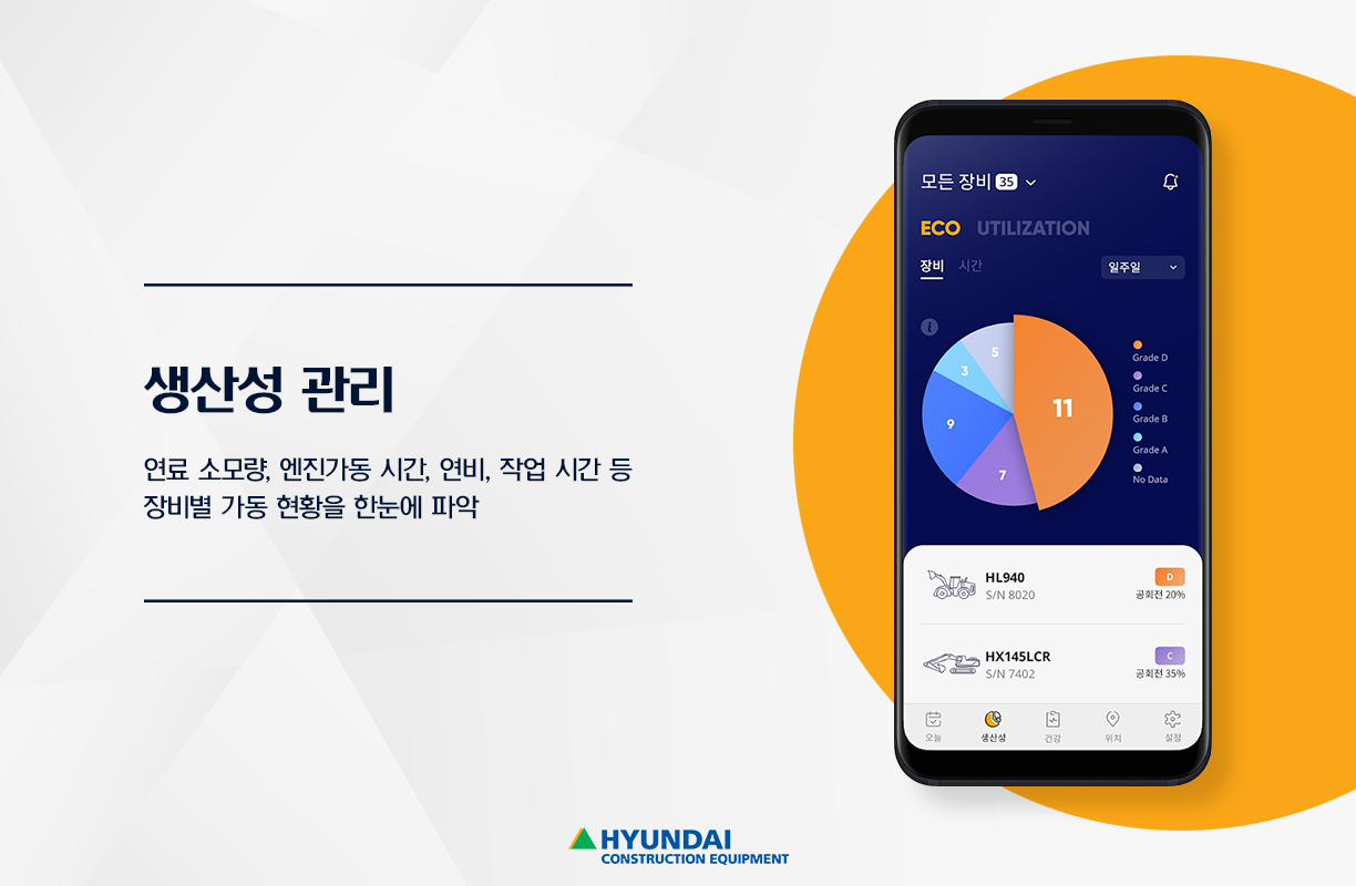 하이메이트는 PC나 모바일 앱을 통해 실시간 장비 가동 정보를 사용자에게 제공합니다. 사용자는 몇 번의 클릭과 터치만으로 장비 상태를 파악할 수 있게 되는 것인데요. 단순한 가동 정보뿐만 아니라 장비 상태를 자체 모니터링하고 고장 발생 시에는 필요한 조치사항을 안내해주기도 합니다. 월별로는 E-mail(또는 웹 페이지)을 통해 작업시간과 연료 소모량 등 장비 관리에 필요한 데이터들의 추이를 정리한 종합 보고서를 제공하여 장비와 작업장의 체계적 관리 또한 지원합니다.