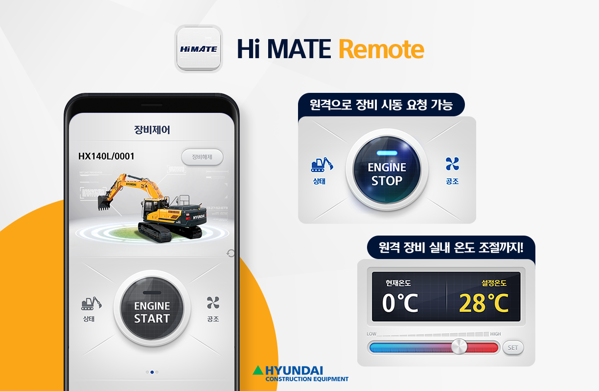 하이메이트 원격시동 시스템이 적용된 장비(HW155A, HX320A)를 보유 중이라면, 하이메이트 원격시동(Hi MATE Remote) 모바일 앱 이용도 가능합니다. 장비가 있는 현장에 도착하지 않은 상태에서도 원격으로 시동을 켤 수 있고, 반대로 장비 시동을 켠 채로 현장을 벗어난 경우에는 앱을 통해 시동을 끌 수도 있는데요. 여기에 공조장치 제어 기능과 장비 실내 온도 조절 기능까지 더해져 보다 편리하게 장비를 운용할 수 있습니다.