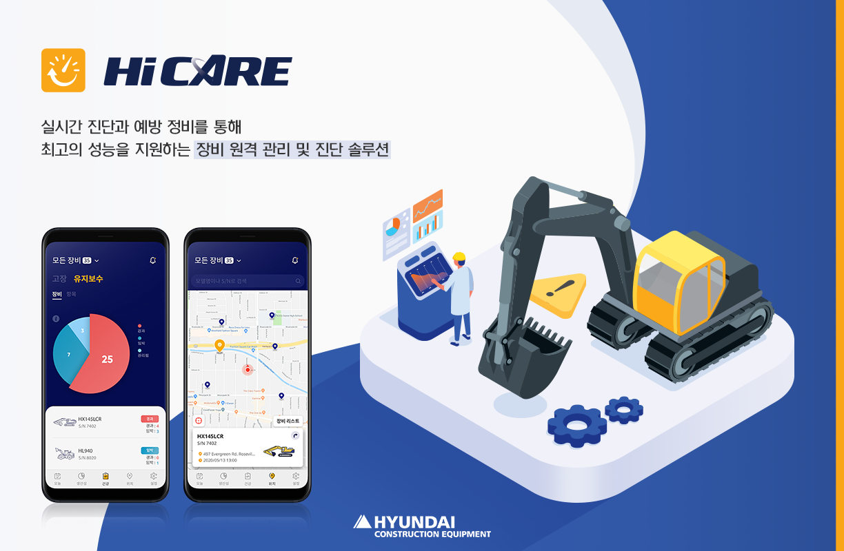 현대건설기계는 2009년 장비 원격 관리 시스템 Hi MATE를 상용화했으며, 2019년에는 스마트폰 앱을 통해 장비를 Fleet 단위로 편리하게 관리할 수 있도록 도와주는 플릿 매니저 앱(Fleet Manager App)을 출시, 손쉬운 장비 관리가 가능하도록 했습니다. 이후 2021년에는 Hi MATE 서비스와 디지털 기술을 활용하여 장비 상태를 실시간으로 모니터링하고, 장비의 고장 징후 발견 시 딜러가 고객에게 즉각적이고 선제적인 조치를 취하여 장비를 수리하거나 고장을 예방하여 주는 프로액트 케어(ProAct Care) 서비스를 론칭하였습니다. Hi CARE 솔루션은 이러한 Hi MATE와 프로액트 케어를 결합한 프리미엄 서비스로, 장비의 다운타임(Downtime, 고장으로 인한 장비 가동 불가 시간)을 최소화 및 장비가동율 증대를 통하여 고객의 기대수익을 극대화합니다.